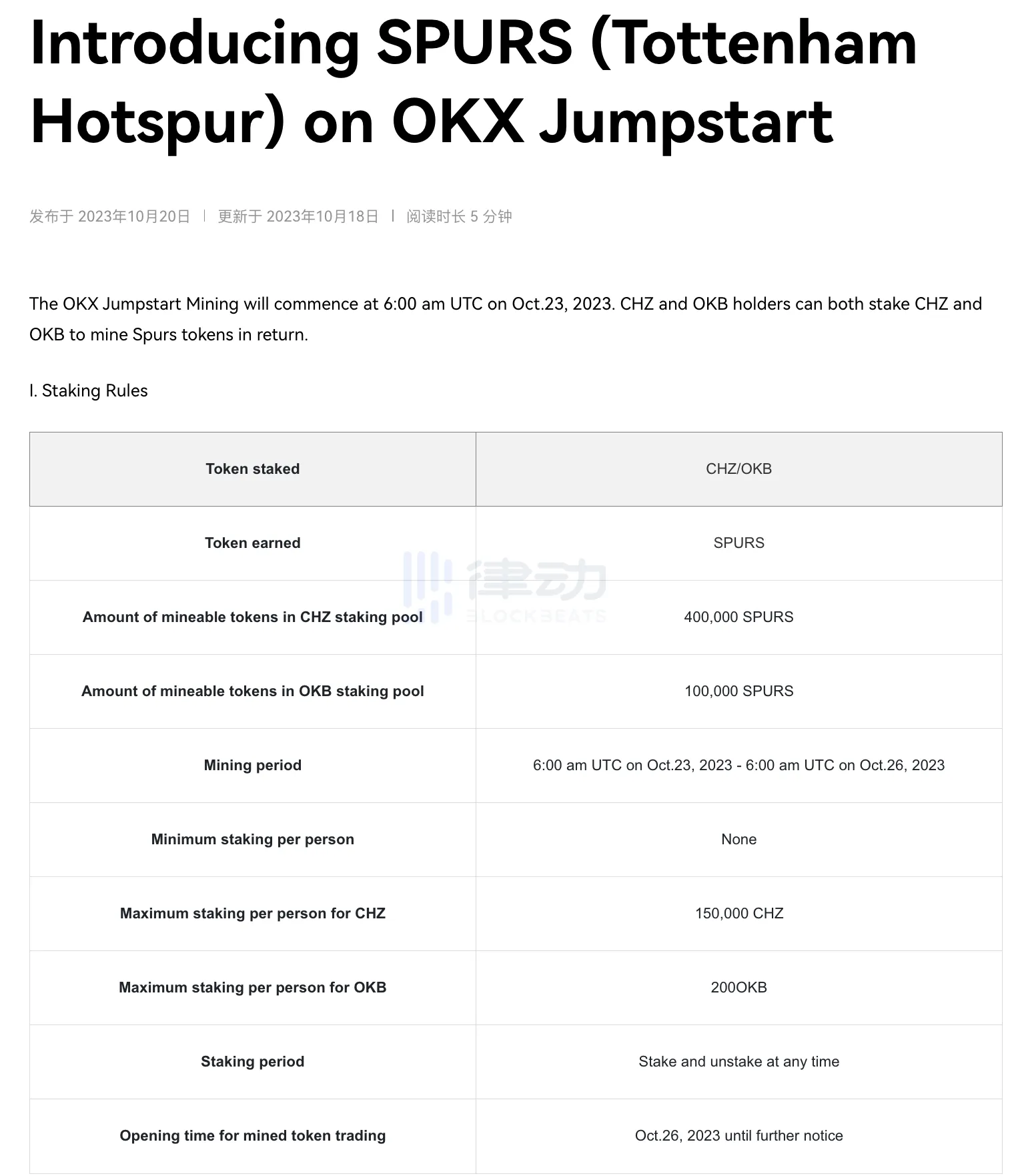 CoinVoice 最新获悉,10 月 18 日,OKX 宣布将于 2023 年 10 月 23 日 14:00 开始,推出 SPURS(Tottenham Hotspur)的 Jumpstart 质押挖矿活动。此次活动,用户可以通过质押 CHZ 和 OKB 来挖矿获得 SPURS 代币。挖矿期限为 2023 年 10 月 23 日 14:00 至 2023 年 10 月 26 日 14:00。