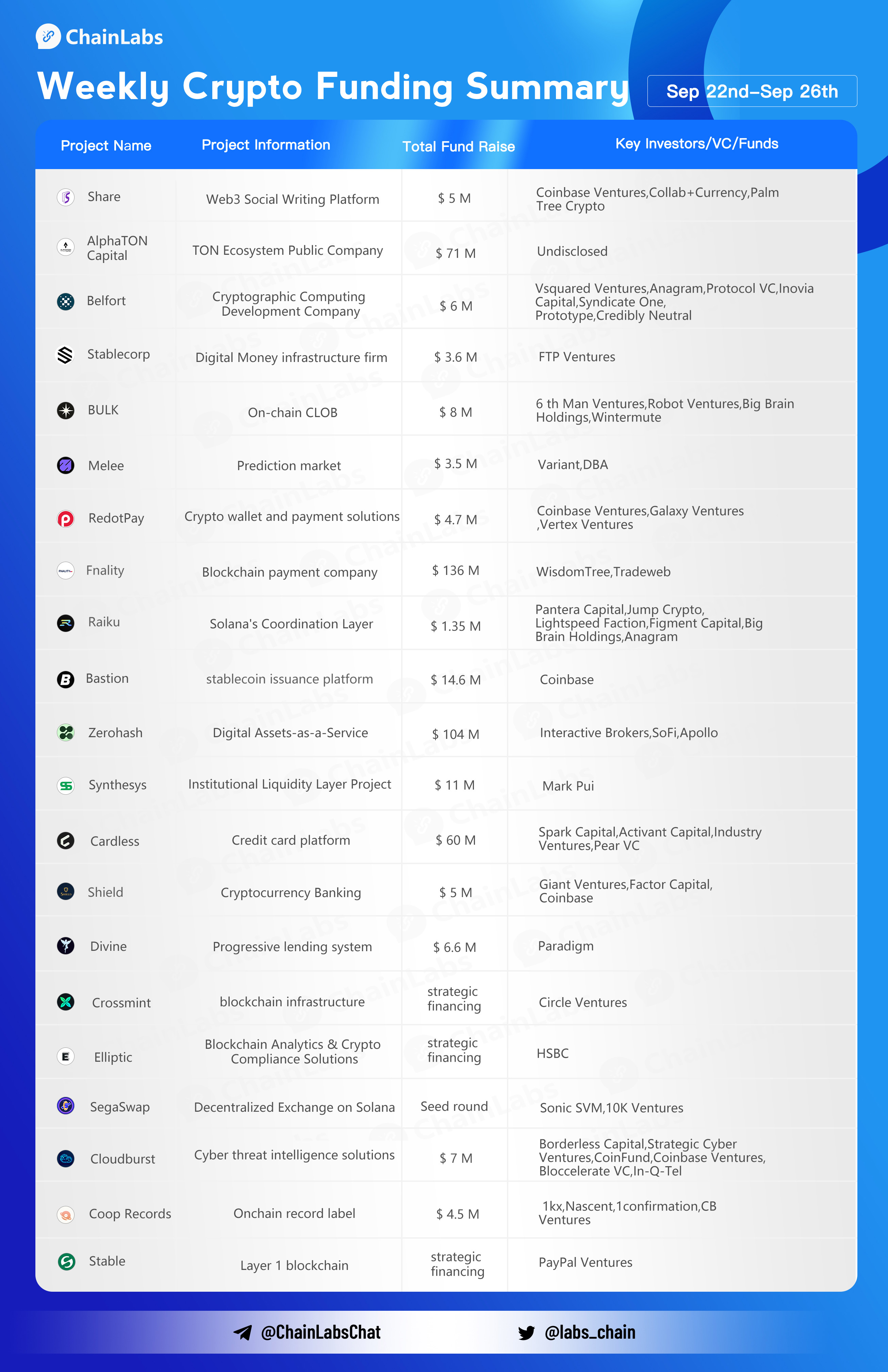 据CoinVoice不完全统计,本周(9.22—9.26)公布的区块链领域项目融资案超20起, 本周千万级美元融资共8笔,其中包括区块链支付公司 Fnality 完成 1.36 亿美元 C 轮融资,WisdomTree 领投,是本周最大笔融资事件。其他热门项目包括网络威胁情报解决方案Cloudburst ,Solana生态永续合约DEXBULK等。在投融资细分赛道中,本周基础设施领域较为火热。以下为本周融资事件一览。