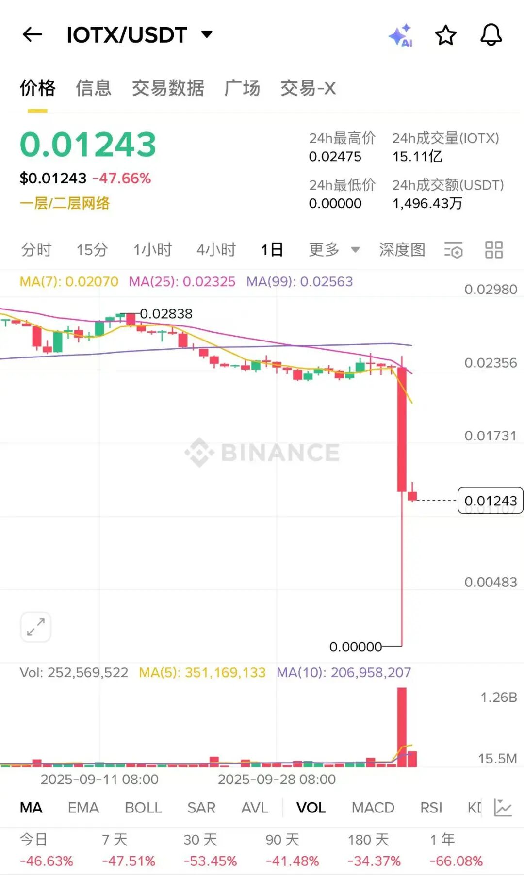 当特朗普的关税消息引爆市场恐慌时,做市商不得不优先保证大项目的安全,把原本分配给小币种的资金抽走。结果,山寨币市场彻底失去了对手盘,卖压砸下来无人承接,价格出现近乎“自由落体”的暴跌。IOTX 等代币一度跌近归零,正是流动性枯竭的最直观体现。