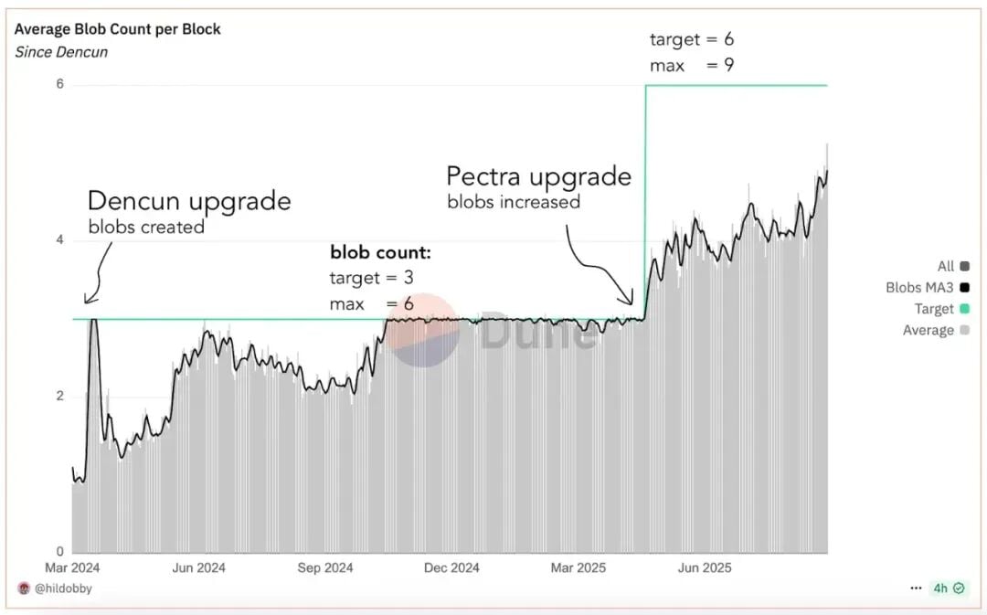 在Dencun升级中首次向网络添加blob时是3个(max 6),后来在Pectra升级中增加到了6个(max 9),在Fusaka之后,将可以以可持续的速度增加,而无需再进行大的网络升级。